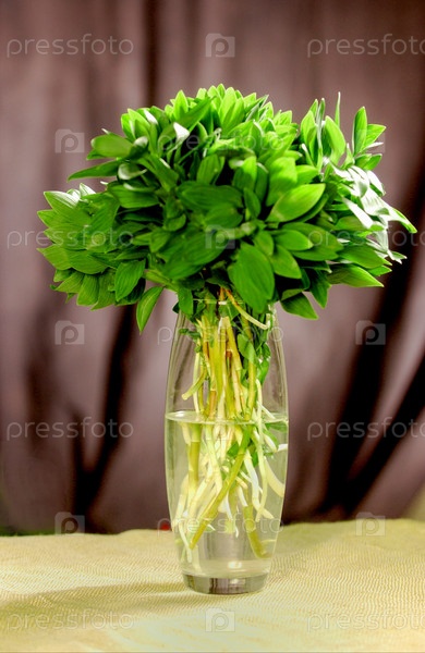Вертикальный крупный план стеклянной вазы с зеленым букетом