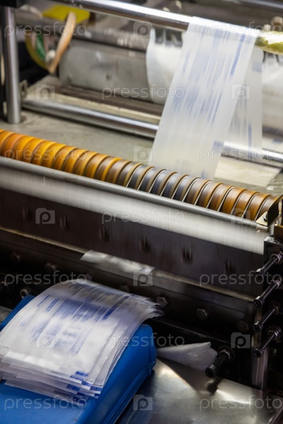 Вертикальный снимок машины, печатающей этикетки для шприцев на складе медицинского производства