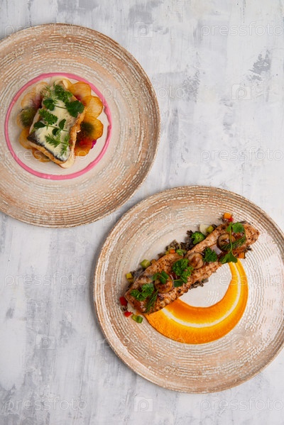 Вид сверху на две красивые и вкусные блюда на тарелках, изолированных на сером фоне