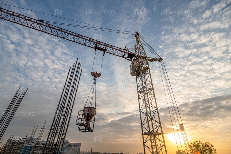 Низкоугольный снимок крана с оборудованием на строительной площадке рядом с новой строительной инфраструктурой