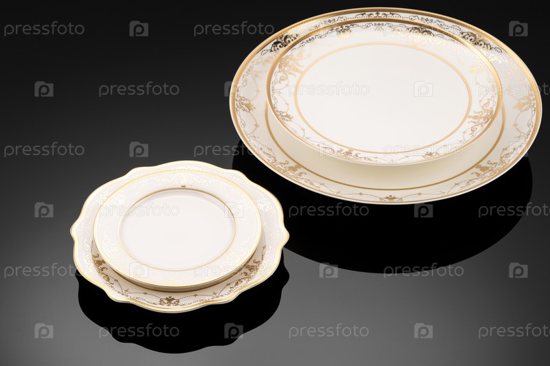 Роскошная посуда на черной отражающей поверхности