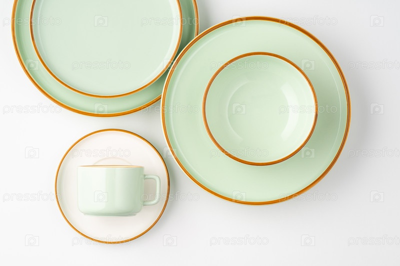 Набор белой и пастельно-зеленой керамической посуды с оранжевыми очертаниями. Вид сверху