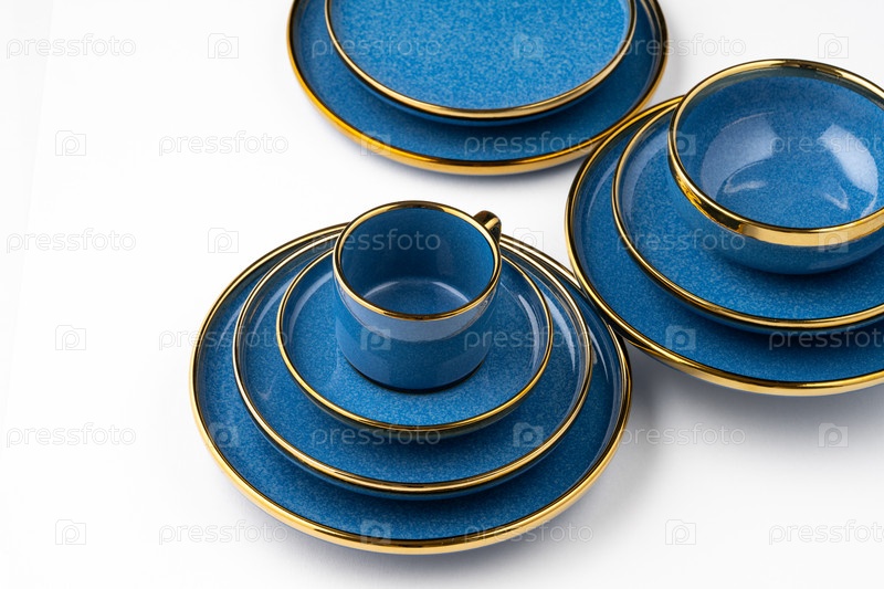 Набор синих керамических тарелок и чашки на белом фоне
