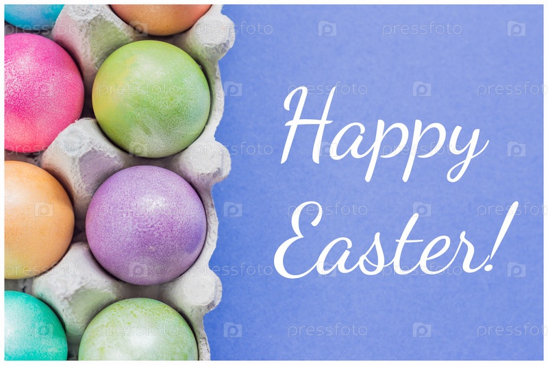 Разноцветные пасхальные яйца в коробке на синем фоне, вид сверху. Открытка с Пасхой