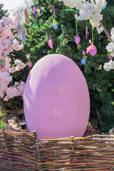 Большое фиолетовое пасхальное яйцо снаружи. Праздничное украшение улицы к праздникам