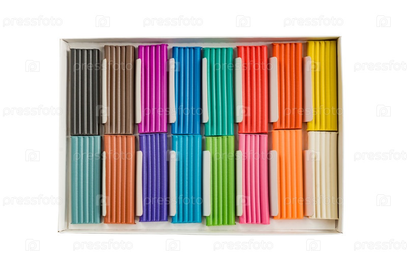 Глина для лепки. Разноцветные пластилиновые батончики в коробке на белом фоне