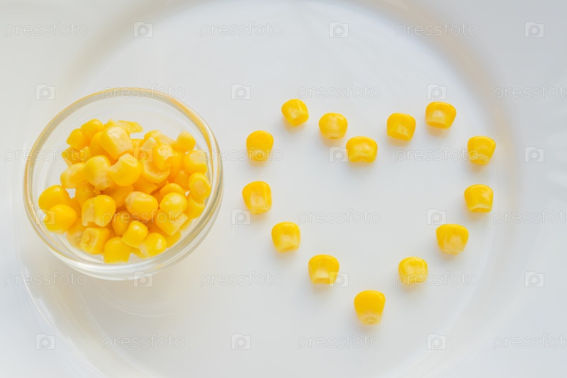 Крупный план сладкой кукурузы в форме сердца на белой тарелке. Чаша с желтыми семенами