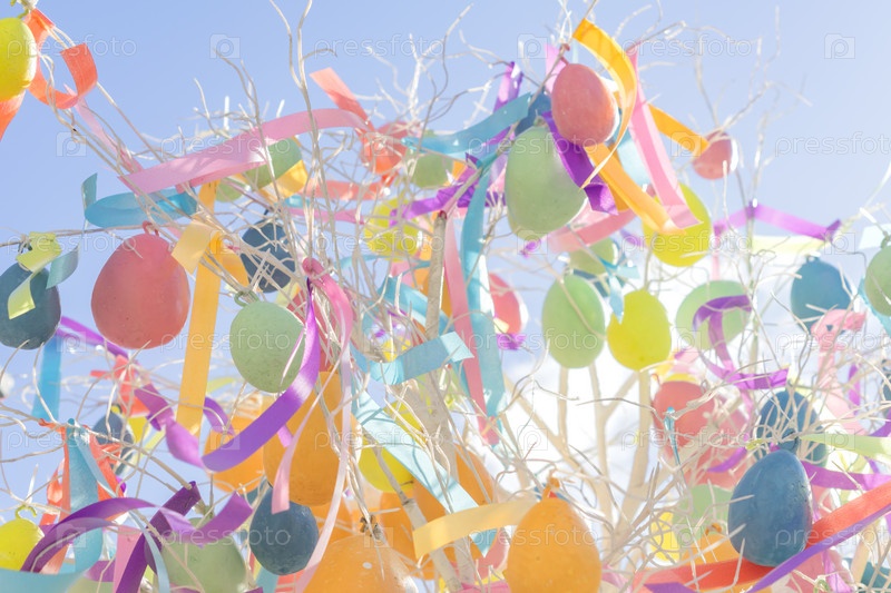 На дереве висят разноцветные яркие пасхальные яйца с лентами. Пасхальный праздничный фон