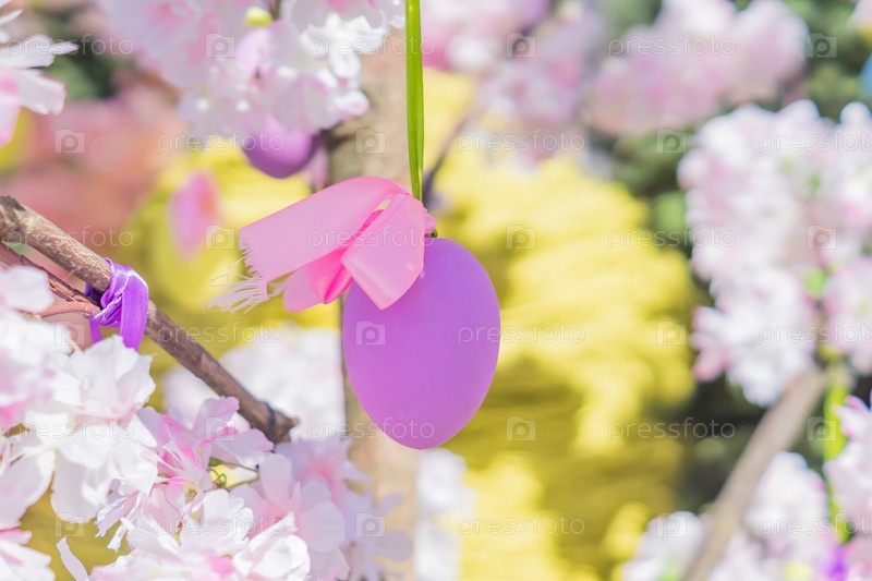 Фиолетовое пасхальное яйцо висит на цветущей ветке яблони. Пасхальное украшение и концепция празднования