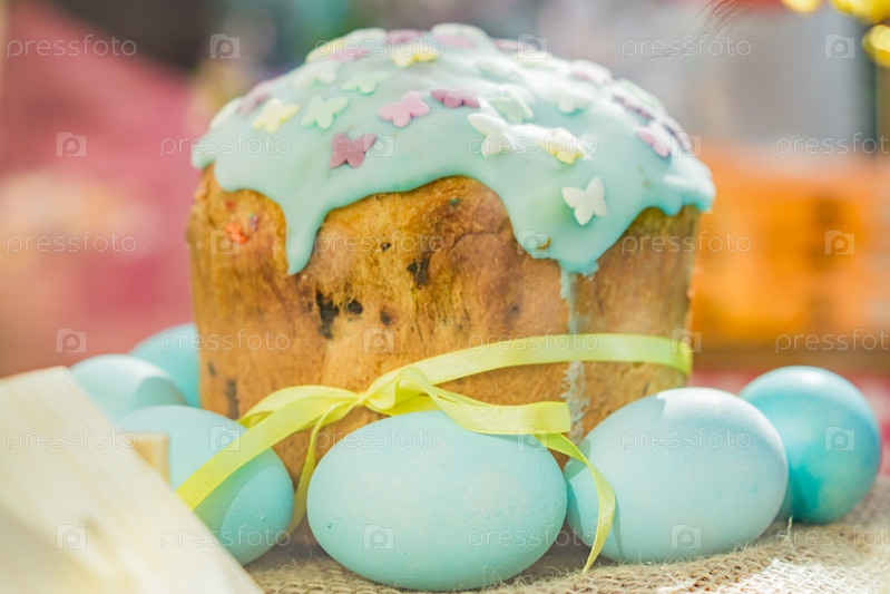 Закройте кулич с глазурью и синими яйцами