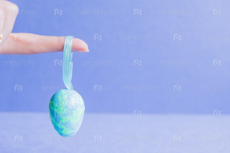 Женская рука держит голубое игристое пасхальное яйцо