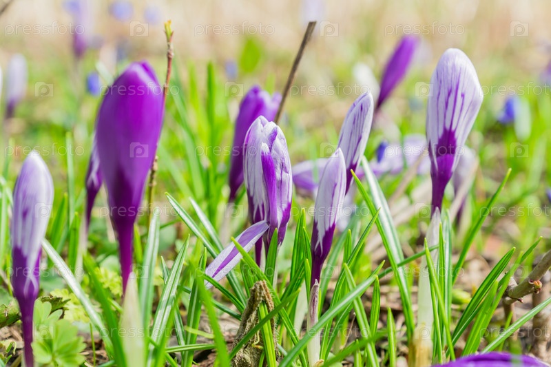 Красочные фиолетовые цветы крокусы цветут в солнечный весенний день в саду