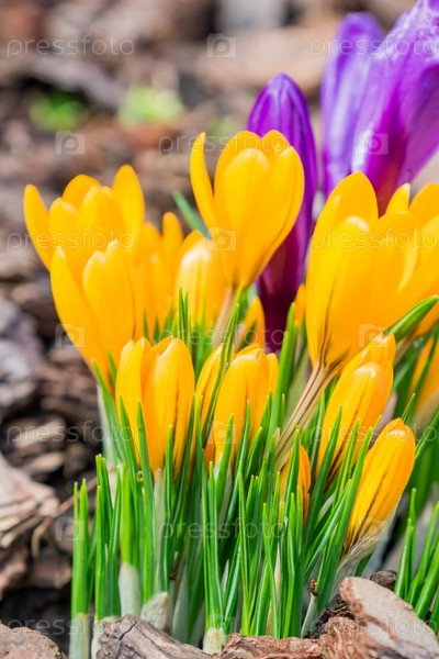 Красочные желтые и фиолетовые цветы крокуса цветут в солнечный весенний день в саду