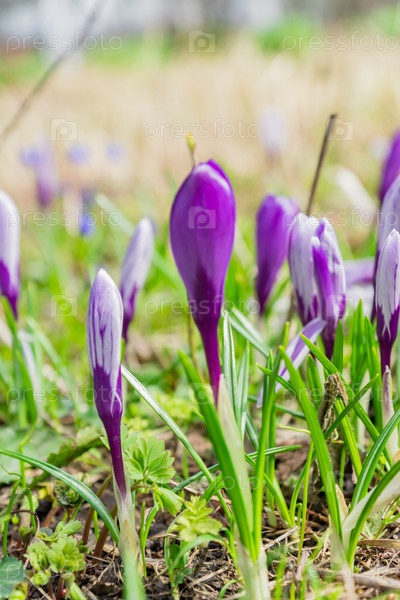 Красочные фиолетовые цветы крокусы цветут в солнечный весенний день в саду