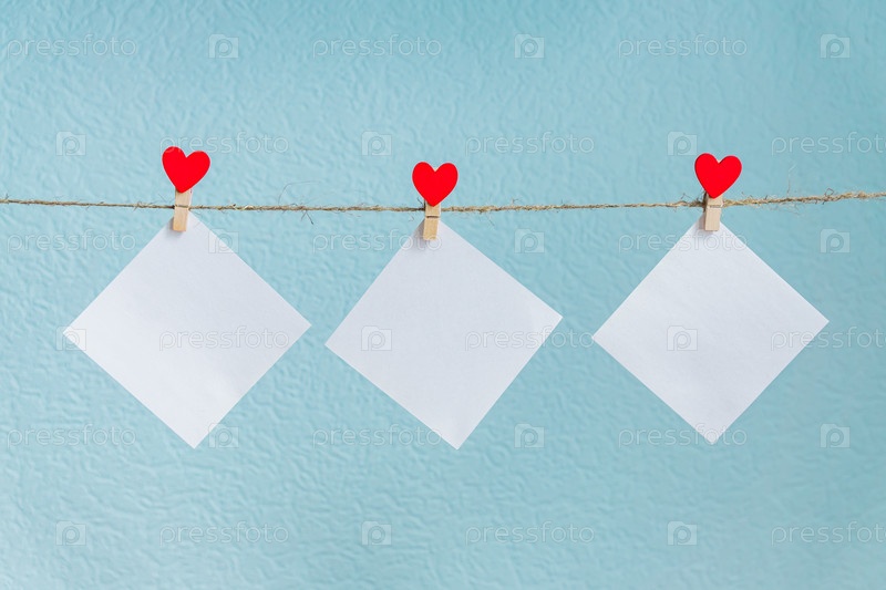 Пустые карточки на булавках с красными сердечками. Макет для текста и синего фона для поздравления с Днем святого Валентина