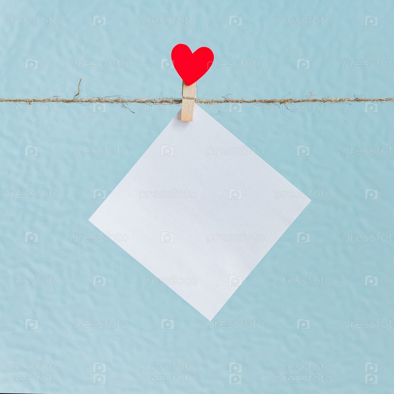 Пустые карточки на булавках с красными сердечками. Макет для текста и синего фона для поздравления с Днем святого Валентина