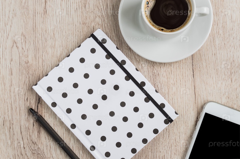 Концепция бизнеса и офиса - черно-белый блокнот в горошек, смартфон и чашка черного кофе на деревянном столе. вид сверху