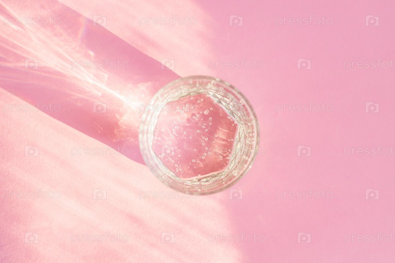Крупным планом газированной воды в прозрачном стекле и солнечных бликов на розовом фоне