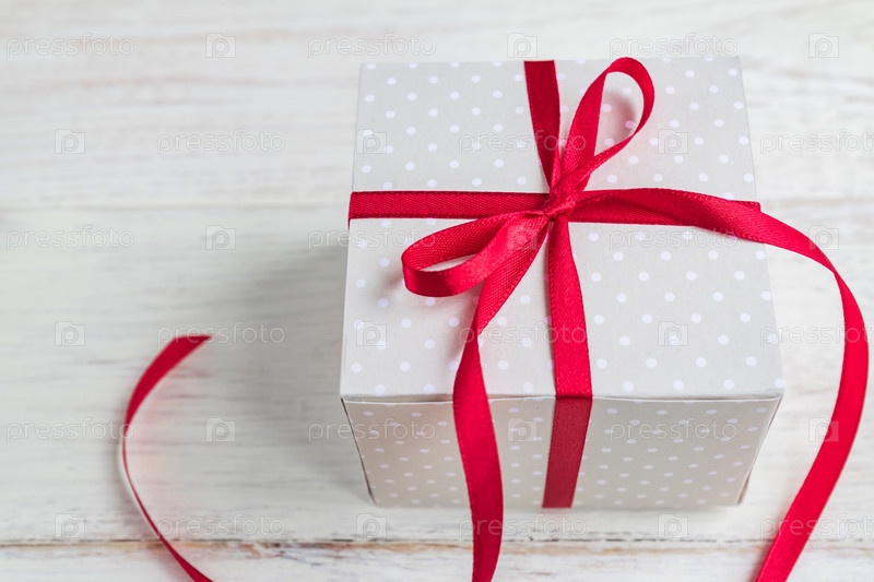 Бежевая подарочная коробка в горошек с бантом из красной ленты на деревянном фоне