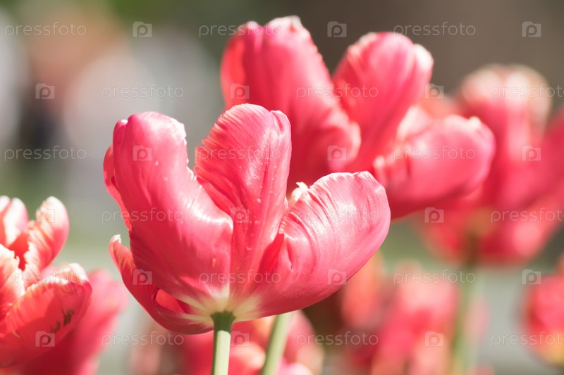 Крупным планом цветущий розовый тюльпан. Цветочный фон. Пейзаж летнего сада. Мягкий фокус