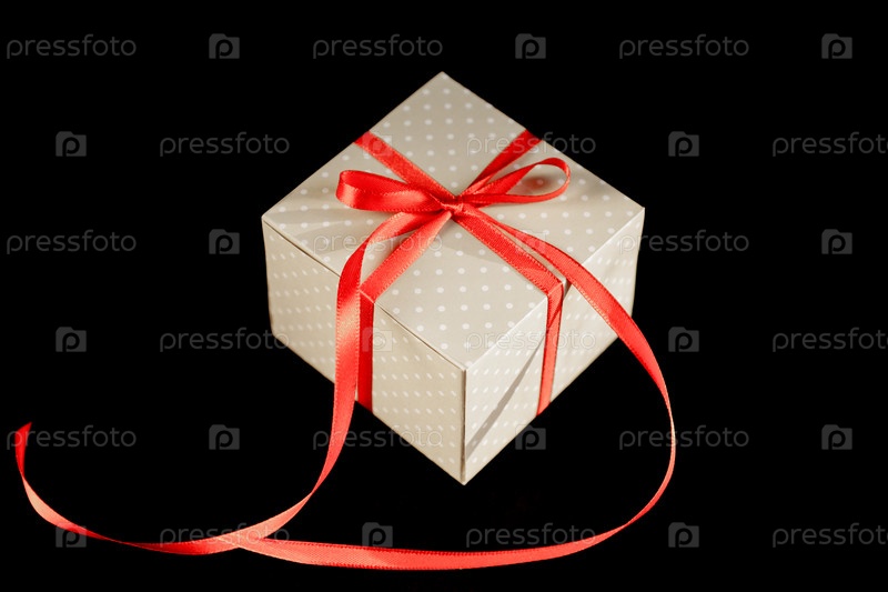 Бежевая подарочная коробка в горошек с бантом из красной ленты на черном фоне с копировальным пространством