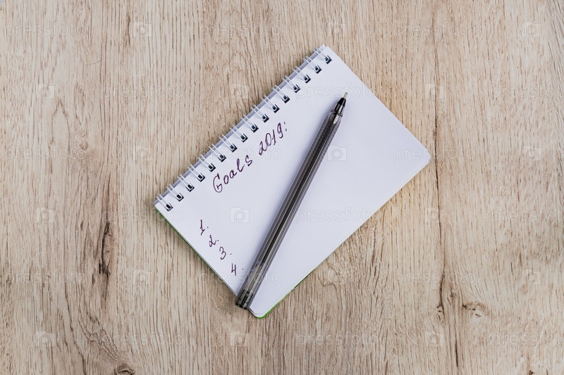 Концепция дела и офиса - пустой блокнот и черная ручка на деревянном столе. Цели 2019. Минимальная плоская планировка, вид сверху