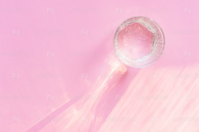 Вид сверху на газированную воду в прозрачном стекле и солнечные блики на розовом фоне