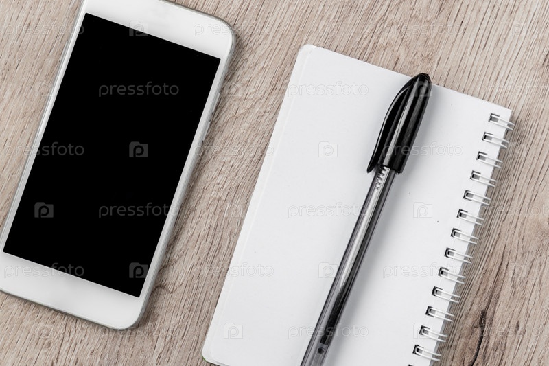 Концепция дела и офиса - пустой блокнот, смартфон и черная ручка на деревянном столе. Минимальная плоская планировка, вид сверху