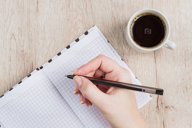 Удерживание руки молодой женщины открыло страницы тетради с черной ручкой рядом с чашкой кофе на деревянном столе. Вид сверху