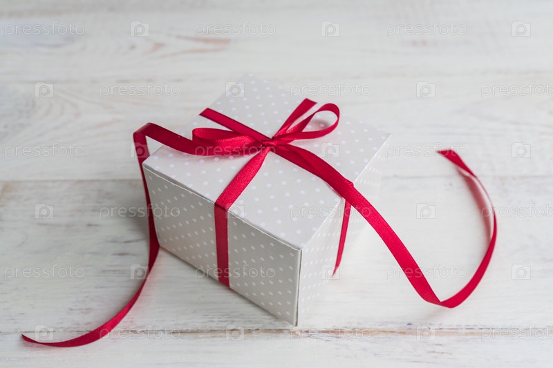 Бежевая подарочная коробка в горошек с бантом из красной ленты на деревянном фоне с копировальным пространством
