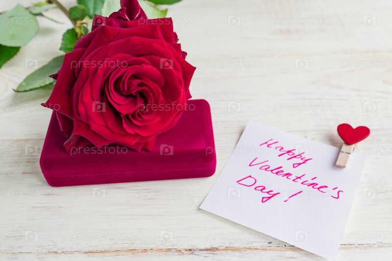 Подарочная коробка ювелирных изделий и красивая красная роза на деревянном фоне. Подарок на день святого Валентина