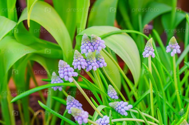 Голубой виноград гиацинт, цветы Muscari Armeniacum на клумбе, мягкий фокус