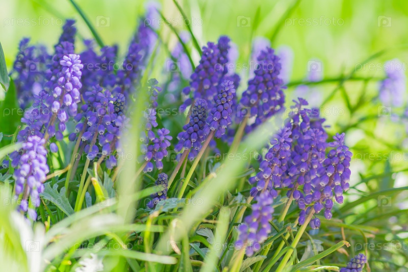 Голубой виноград гиацинт, цветы Muscari Armeniacum на клумбе