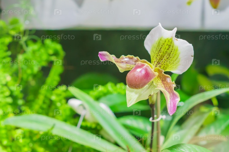 Большой план цветущей орхидеи Paphiopedilum в ботаническом саду