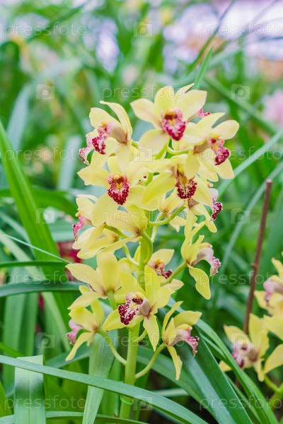 Разноцветные экзотические цветы орхидеи в ботаническом саду