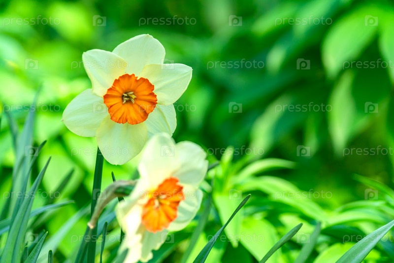 Нежные желтые и белые цветущие цветы нарцисса в весеннем саду, цветочный фон