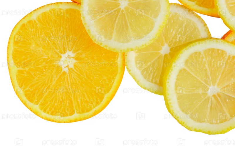 Ломтик цитрусовых, апельсины и лимоны на белом фоне, обтравочный контур