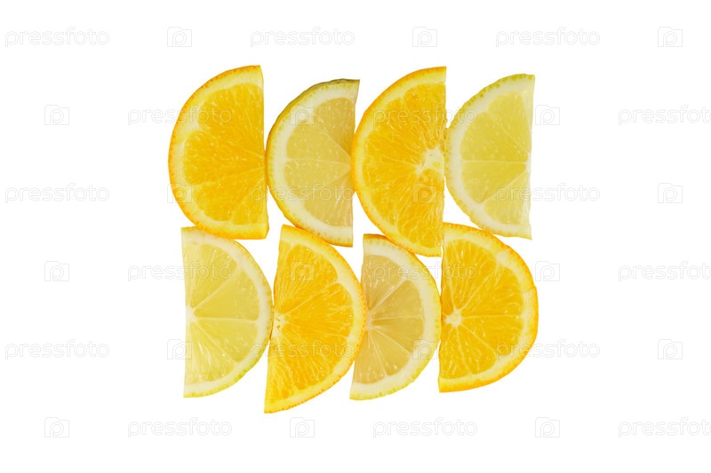 Ломтик цитрусовых, половинки апельсинов и лимонов на белом фоне, обтравочный контур