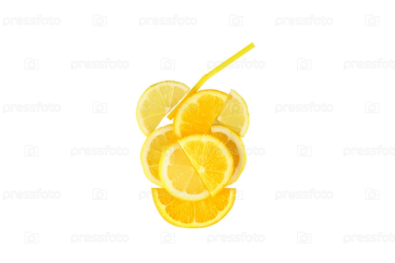 Стакан цитрусового сока из апельсиновых и лимонных ломтиков с коктейльной соломинкой на белом фоне