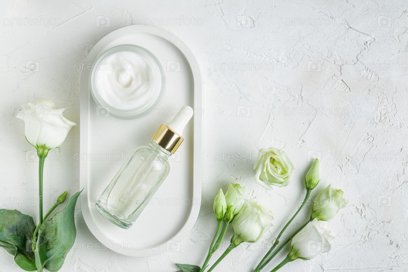 Увлажняющий крем для лица, сыворотка или эфирное масло в стеклянных бутылках и цветы эустомы на белом бетонном фоне. Плоская планировка, вид сверху. Набор косметических средств по уходу за кожей и телом