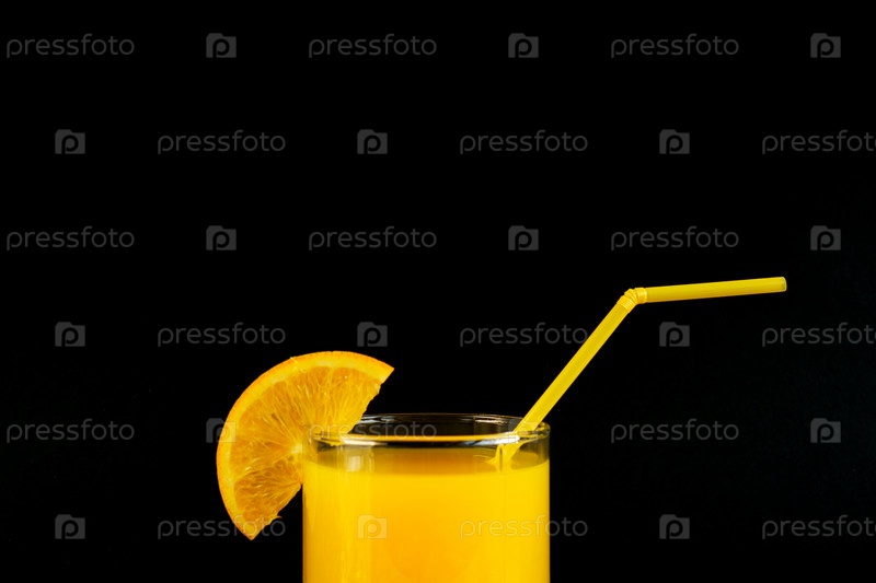 Свежий здоровый апельсиновый сок в стакане с ломтиком цитрусовых на черном фоне. Скопируйте место для текста