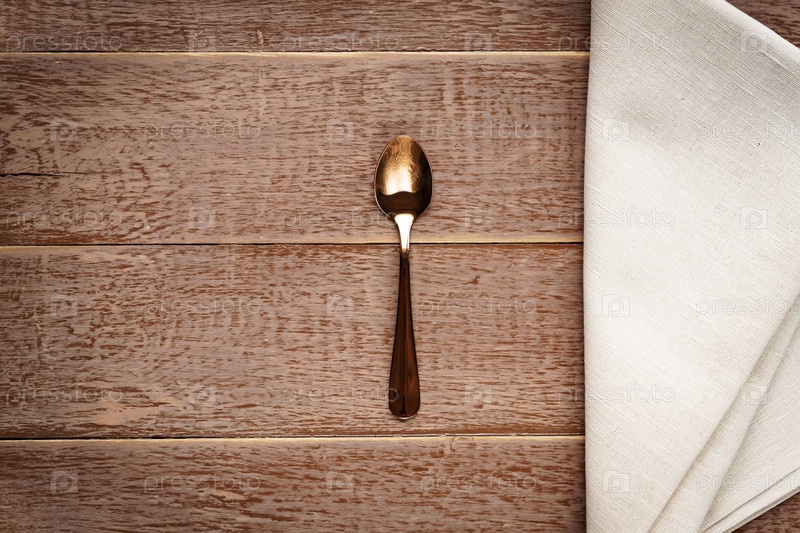 Вид сверху на тканевую салфетку бежевого цвета и чайную ложку на деревянном столе