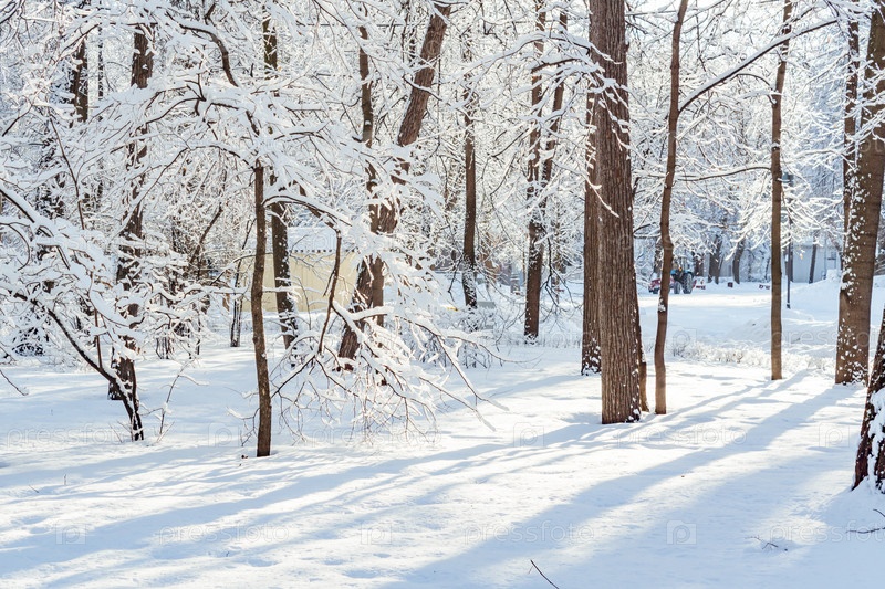 Морозный зимний пейзаж. Деревья в снегу в парке