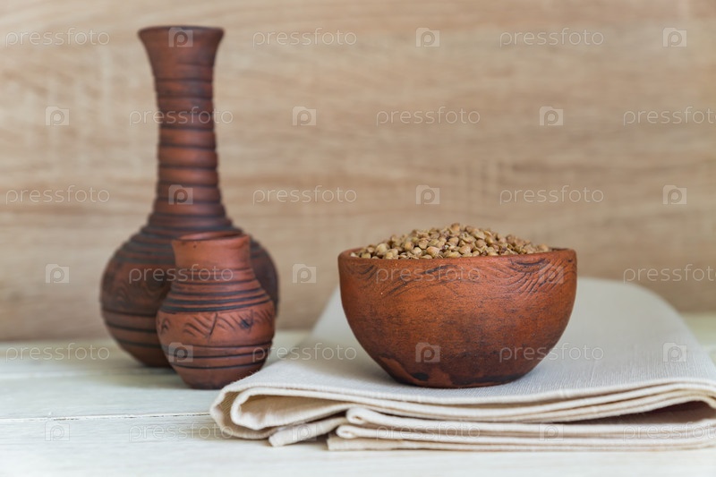 Сухая гречка в коричневой глиняной миске на деревянном столе. безглютеновое зерно для здорового питания