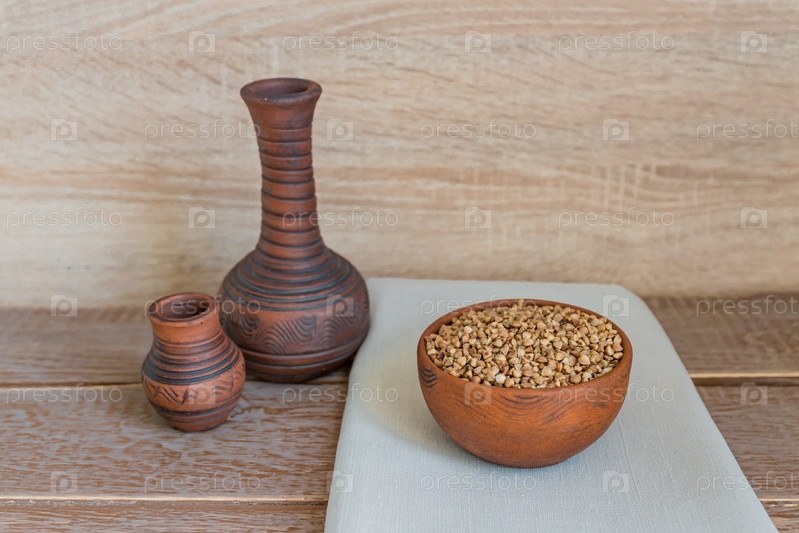 Сухая гречка в коричневой глиняной миске на деревянном столе. безглютеновое зерно для здорового питания