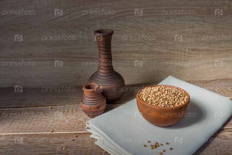 Сухая гречка в коричневой глиняной миске на деревянном столе. безглютеновое зерно для здорового питания