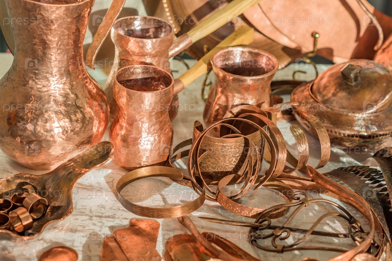 Винтажная медная посуда и аксессуары - кофейники, банки, кольца, браслеты на блошином рынке