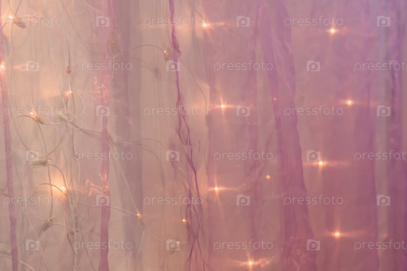 Фон с фиолетовой текстурой ткани из органзы и светодиодной гирляндой