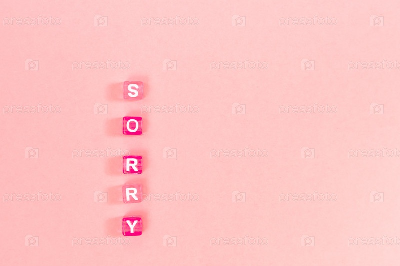 Извините надпись из разноцветных кубических бусин с буквами. Праздничная концепция розового фона с копировальным пространством