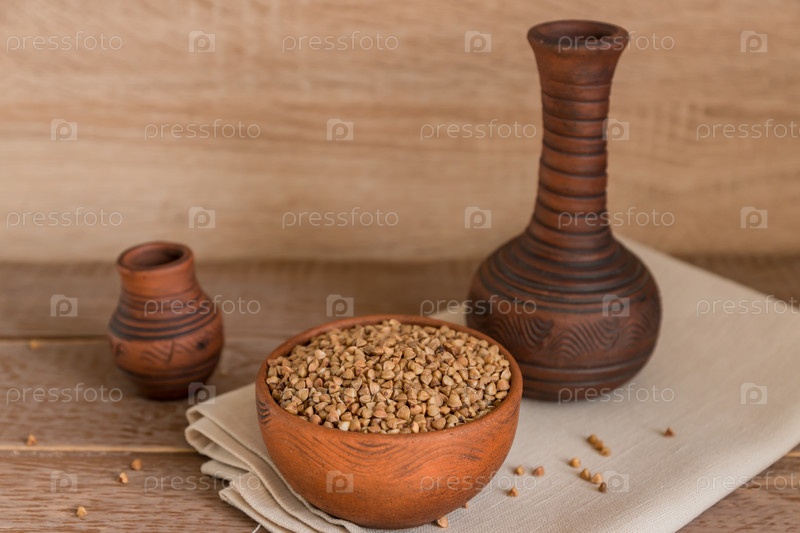 Сухая гречка в коричневой глиняной миске на деревянном столе. безглютеновое зерно для здорового питания